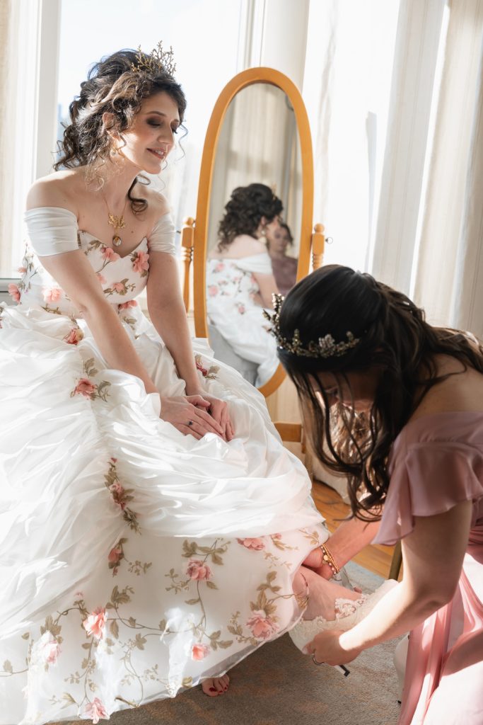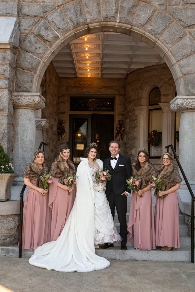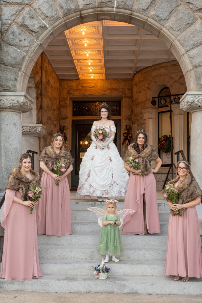 It was important to me for my bridesmaids to feel special that day, so I had them choose their own dresses and then bought them all matching sets of tiaras and earrings so we could all be faerie princesses together. It was so much fun watching their faces all light up as they opened them in a white elephant game and chose their favorite ones, along with fairytale-themed tote bags and faux fur wraps in case of cold weather.
