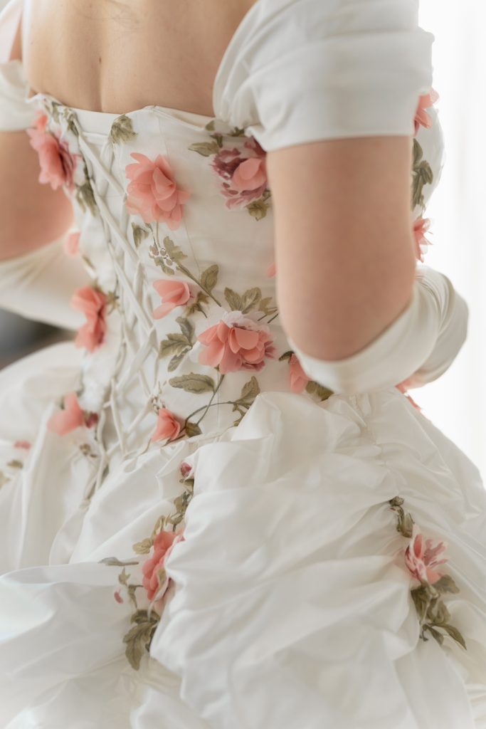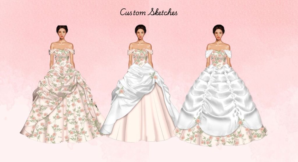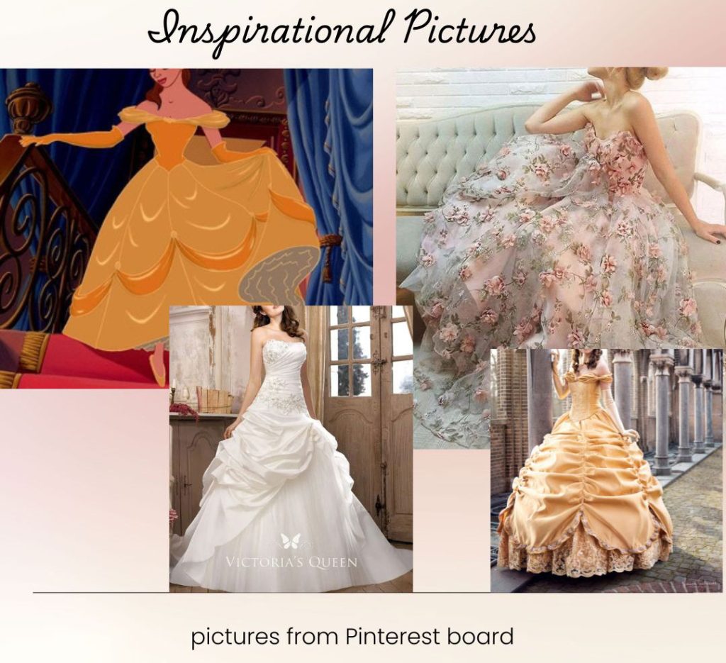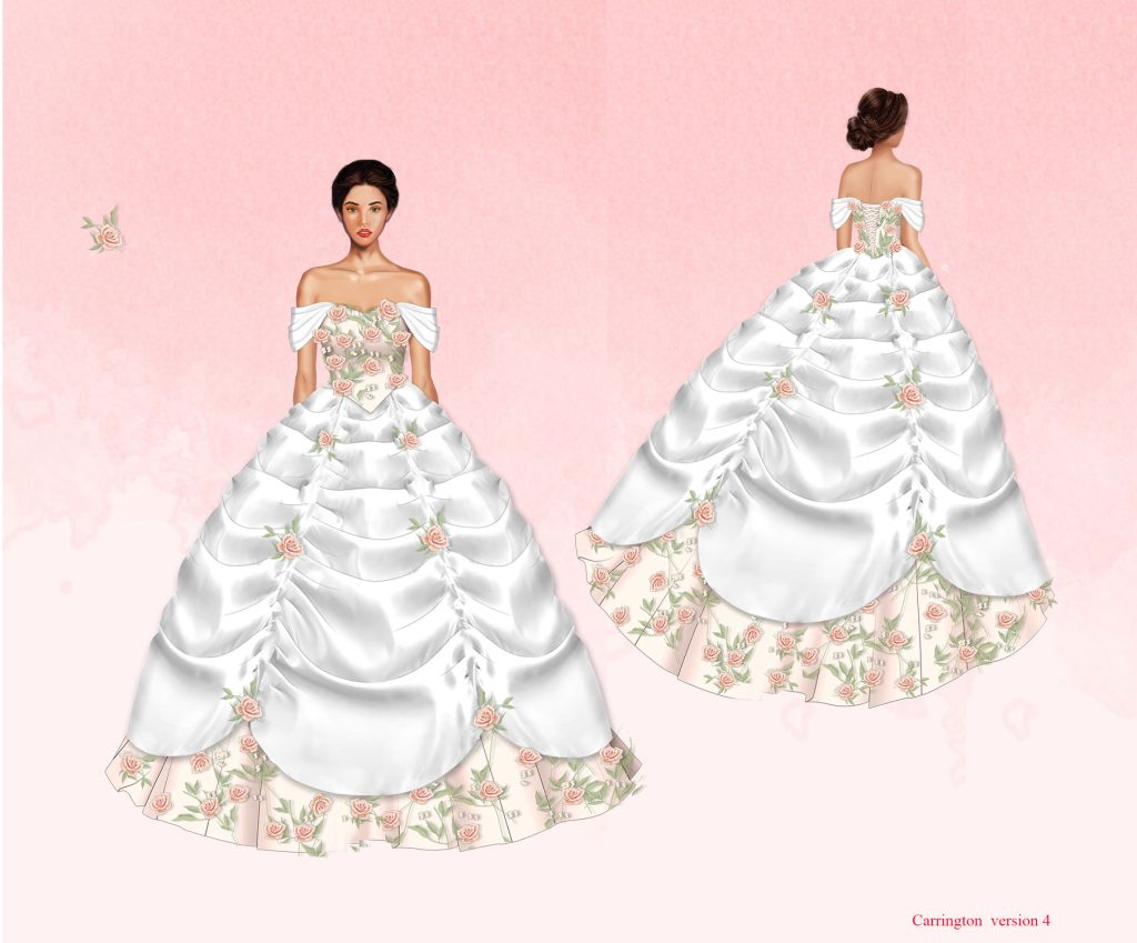 Just a couple of days later, I excitedly opened my email to find the first sketch of my dress waiting for me! I could hardly believe it—it looked exactly like what we had discussed. It’s hard to describe the feeling of seeing something that previously only existed in your head represented onscreen. There’s a tingly sort of electricity to it. Moreover, I hadn’t realized until I saw it, but the dress silhouette I had been envisioning all that time was almost exactly like Belle’s yellow ball gown from Disney’s Beauty and the Beast! I had been putting it together in my head piece by piece without even realizing it. Even the three-dimensional roses could have been (but weren’t intended to be) a nod to Belle.