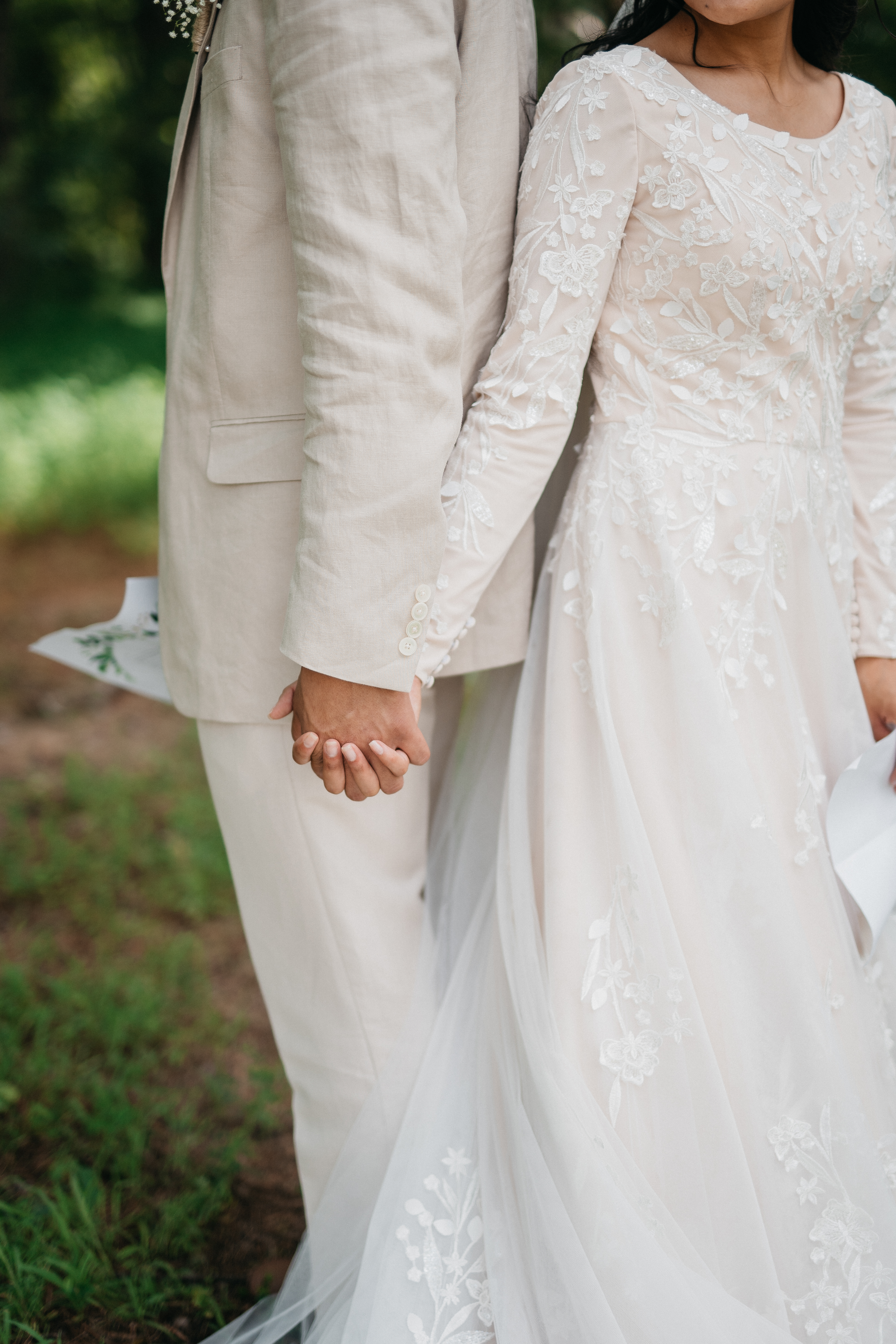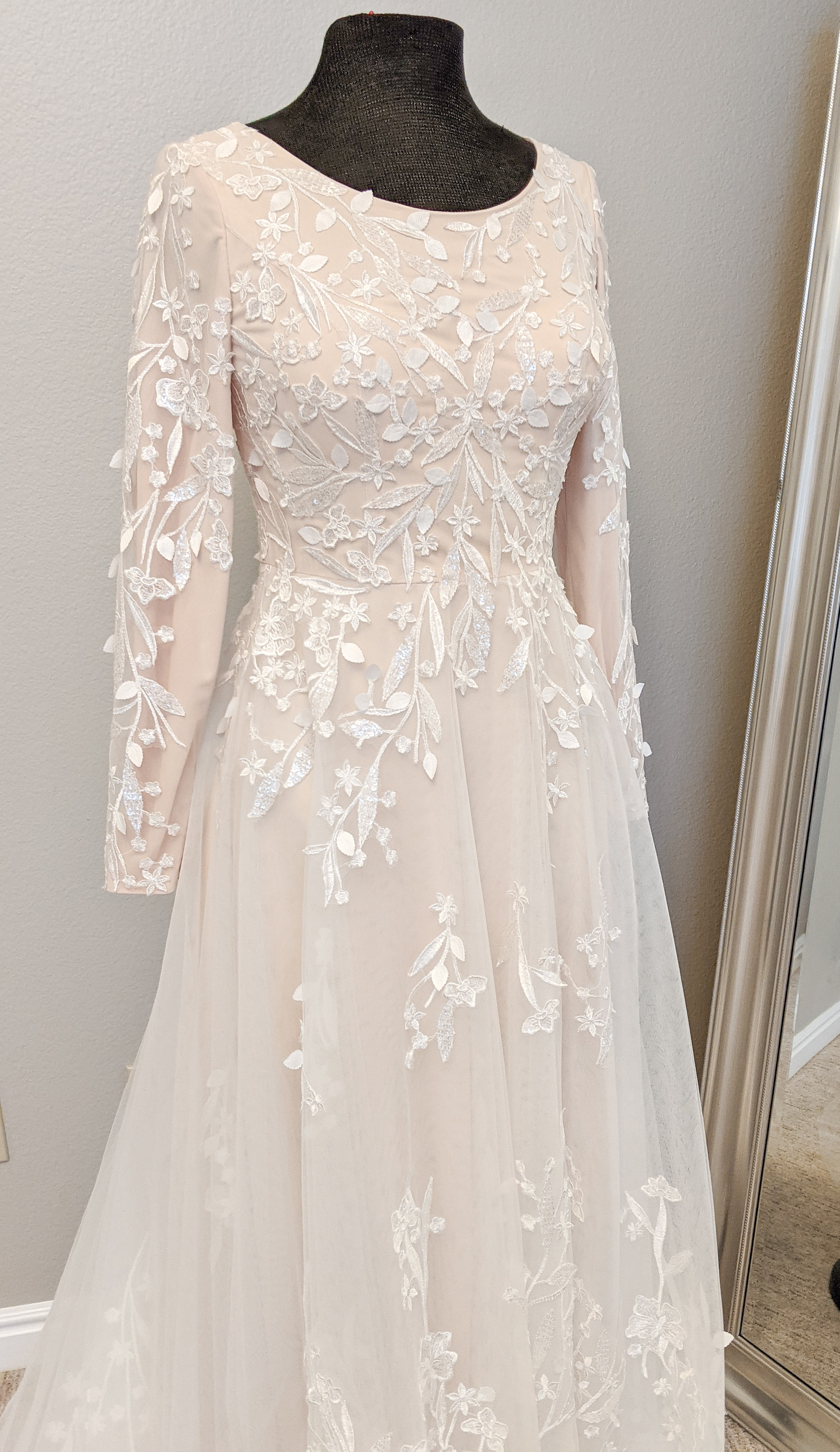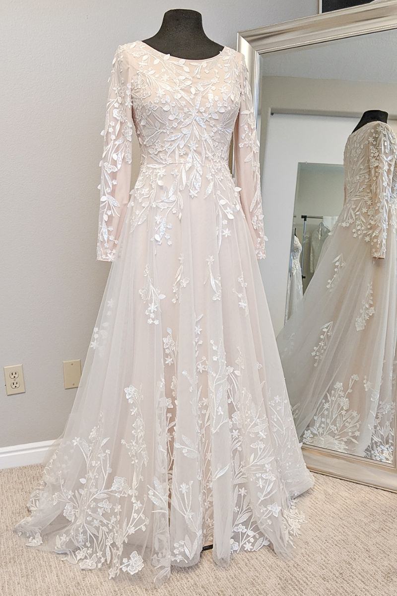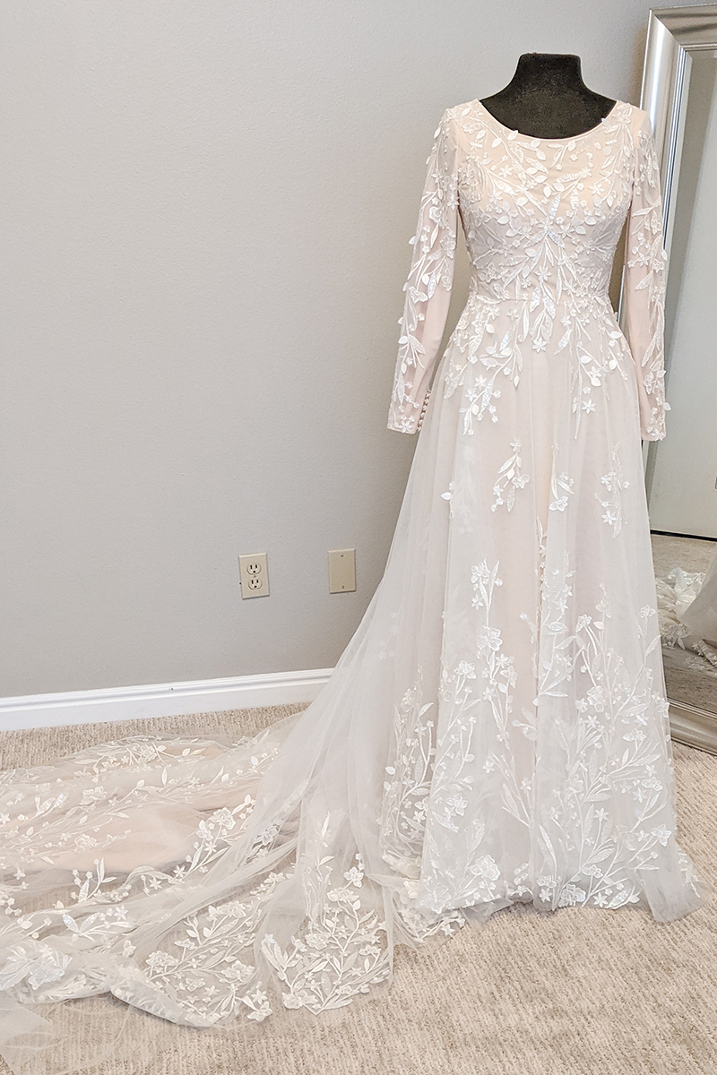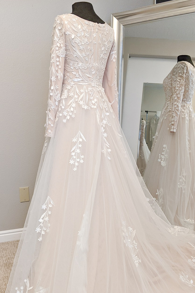 Our Leif gown is the perfect mix of traditional and modern touches. This flattering A-line silhouette is designed with a full tulle and lace skirt embellished with a vine and leaf pattern. Leif is designed with a scoop neck and fully lined long sleeves which are light enough to make her the perfect dress for any season.